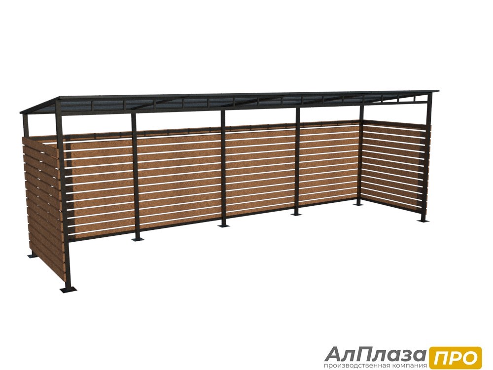 Ограждение для контейнерной площадки серии "FORESTER LITE" (4 контейнера) изготавливается из металлического каркаса сечением 50*50*2,0 и 40*20*1,5. Каркас окрашивается полимерно-порошковой краской, цвет можно выбрать по каталогу RAL. Боковые стенки доской из лиственницы покрытой лаком. Цвет так же можно выбрать согласно каталогу. Крепление доски производится при помощи саморезов к каркасу ограждения. Крыша покрыта прозрачным сотовым поликарбонатом толщиной 6 мм. Крепление ограждения ТБО возможно как к бетонному основанию при помощи анкеров, а также при помощи бетонирования столбов в грунте.
