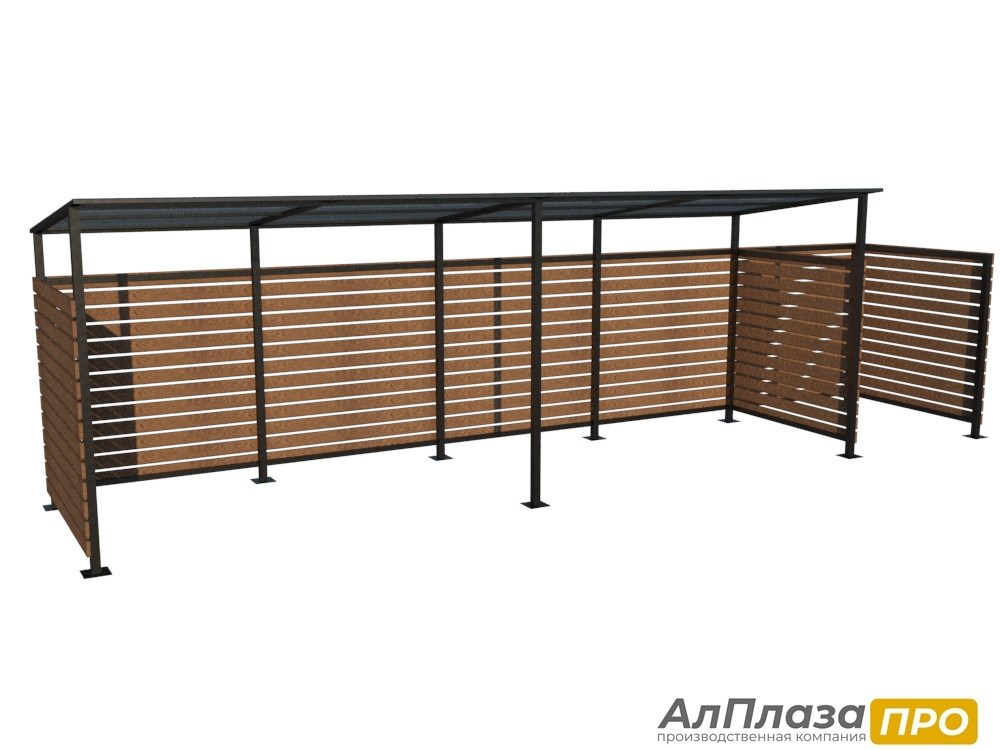 Ограждение для контейнерной площадки серии "FORESTER LITE" (4 контейнера+Доп. секция) изготавливается из металлического каркаса сечением 50*50*1,5 и 40*20*1,5. Каркас окрашивается полимерно-порошковой краской, цвет можно выбрать по каталогу RAL. Боковые стенки доской из лиственницы покрытой лаком. Цвет так же можно выбрать согласно каталогу. Крепление доски производится при помощи саморезов к каркасу ограждения. Крыша покрыта прозрачным сотовым поликарбонатом толщиной 6 мм. Крепление ограждения ТБО возможно как к бетонному основанию при помощи анкеров, а также при помощи бетонирования столбов в грунте.